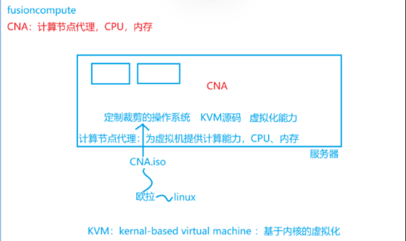 CNA:安装了CNA操作系统主机,叫做CNA主机,CNA主机具备虚拟化的能力,为虚拟机提供资源,CNA是需要安装在物理服务器。