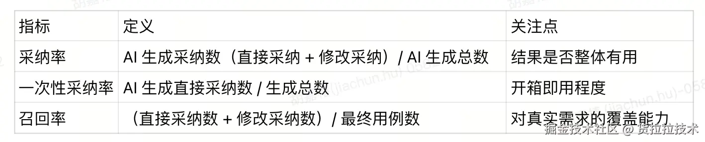 - 指标要覆盖全链路价值:可用率、覆盖率、返工率比"生成条数"更关键;
