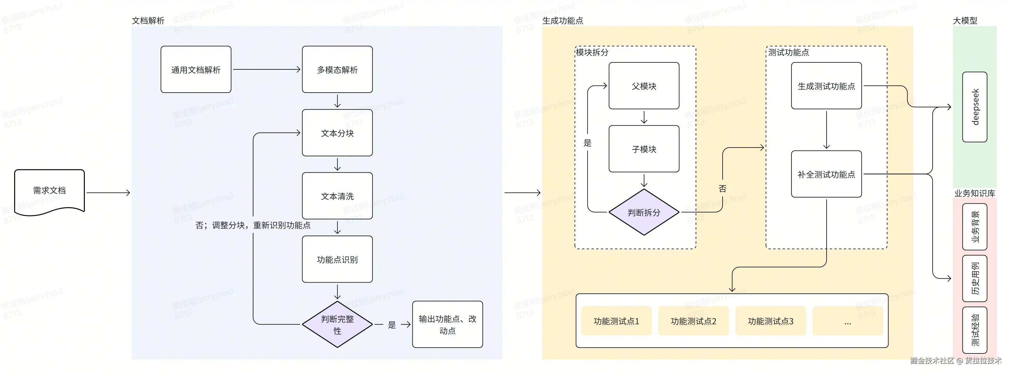 文档解析与功能点生成前置后,系统先完成模块拆分和补全校验,再进入具体用例设计。
