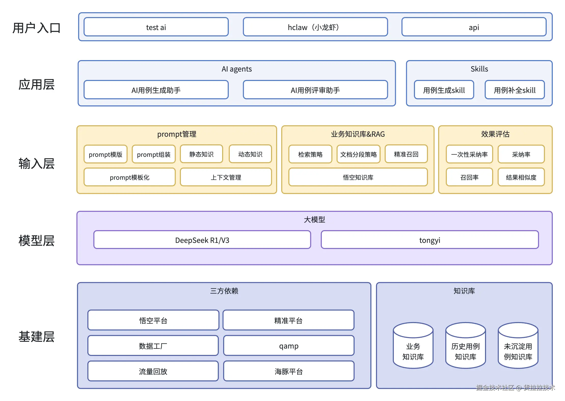 这篇文章分享一条真实的落地路径:我们不是直接追求"AI 一键生成完美用例",而是先用 MVP 验证方向,再用 1.0 补齐输入解析、Prompt 工程化、知识工程和检索闭环,最后把能力沉淀到测试智能体并skill化赋能"小龙虾"。文末会给出可直接复用的实践方法与避坑点。 -- AI用例生成项目组