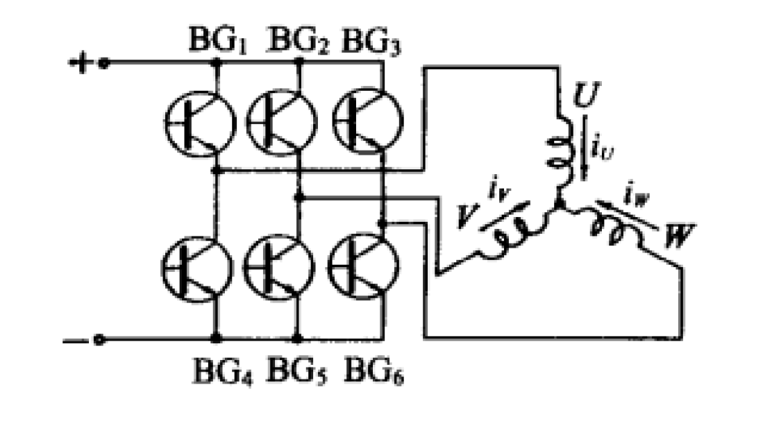 - 第四步(t=180∘+t=180^{\circ+}t=180∘+) :BG2,BG4BG_2, BG_4BG2,BG4 导通。电流路径:电源正极 →BG2→V→U→BG4→\rightarrow BG_2 \rightarrow V \rightarrow U \rightarrow BG_4 \rightarrow→BG2→V→U→BG4→ 电源负极。(W 相悬空)