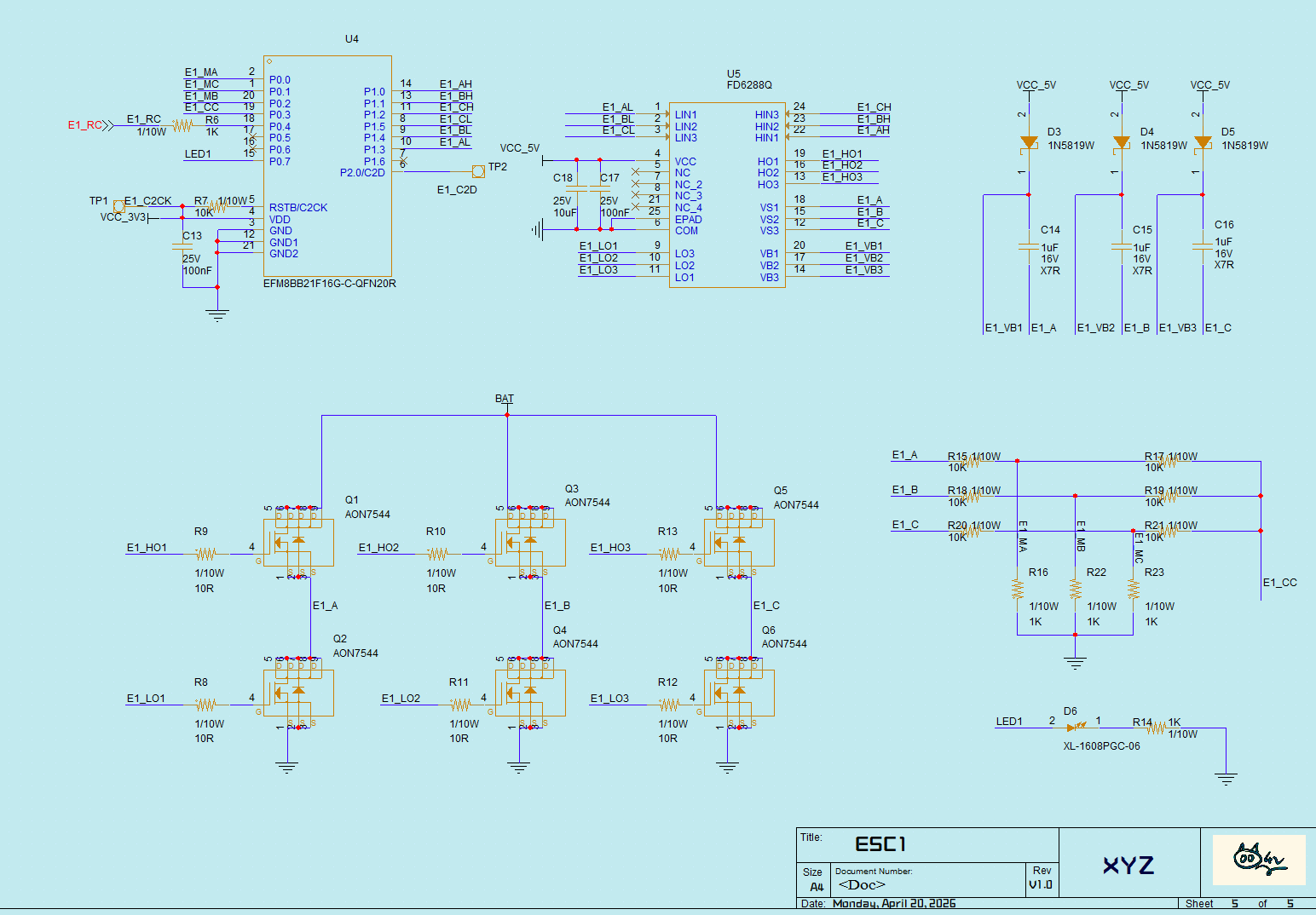 电调采用兼顾低成本与高可靠性的"主控MCU + 独立栅极驱动器 + 全N管MOS桥"经典架构。核心主控选用在开源电调中极为常见的8位MCU EFM8BB21F16G(U4),它负责解析外部油门信号,并利用内部高速ADC对电压进行采样。为了印证前文推导的 enon−fed=unon−fed−une_{non-fed} = u_{non-fed} - u_nenon−fed=unon−fed−un 公式,电路右侧采用了由10KΩ和1KΩ组成的电阻分压网络,将相电压按1/11比例降压送入MCU(E1_MA/MB/MC);同时通过三个10KΩ电阻(R17/R19/R21)星型连接汇聚于E1_CC节点,成功构造出物理上的"虚拟中性点",从而让MCU通过比较悬空相与E1_CC的电压精准捕捉过零点。在功率驱动方面,选用了FD6288Q(U5)三相半桥栅极驱动IC,配合由1N5819W二极管与1uF电容组成的经典自举升压电路(Bootstrap),为高边MOS管提供充足的栅极电压。最终的三相逆变桥由6颗AON7544高性能N沟道MOSFET(Q1~Q6)构成,每颗管子的栅极均串联了10Ω限流电阻以抑制开关寄生振荡(Ringing),平衡了开关速度与EMI,确保电流平滑切换。