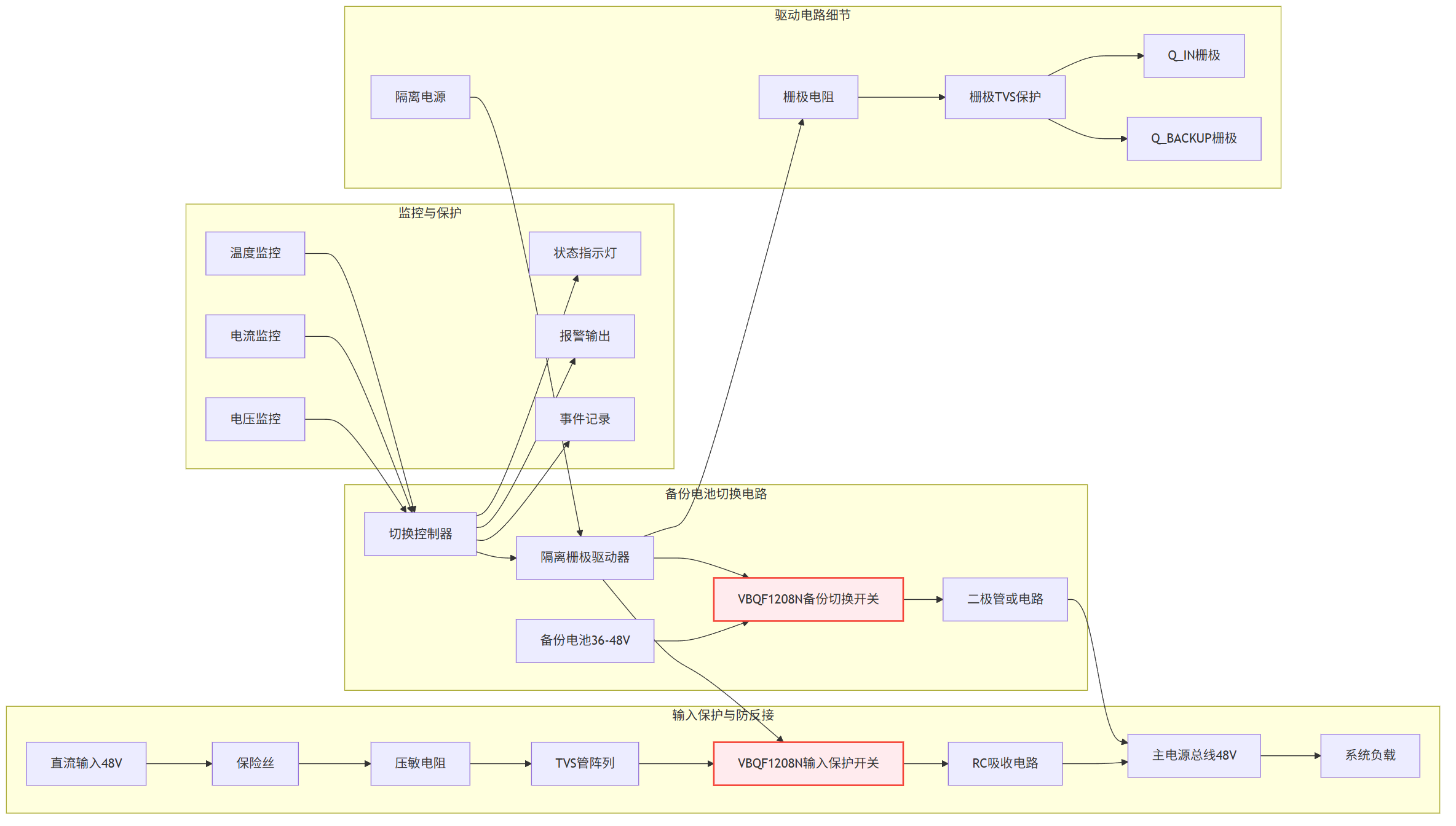 备份电源专项:电池备份切换电路可增加互锁逻辑与状态监测,与VBQF1208N配合实现无缝安全切换。