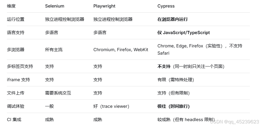 二、Cypress 与 Selenium、Playwright 对比