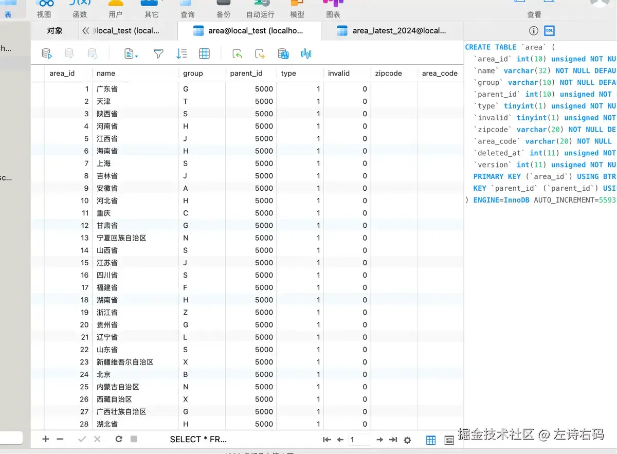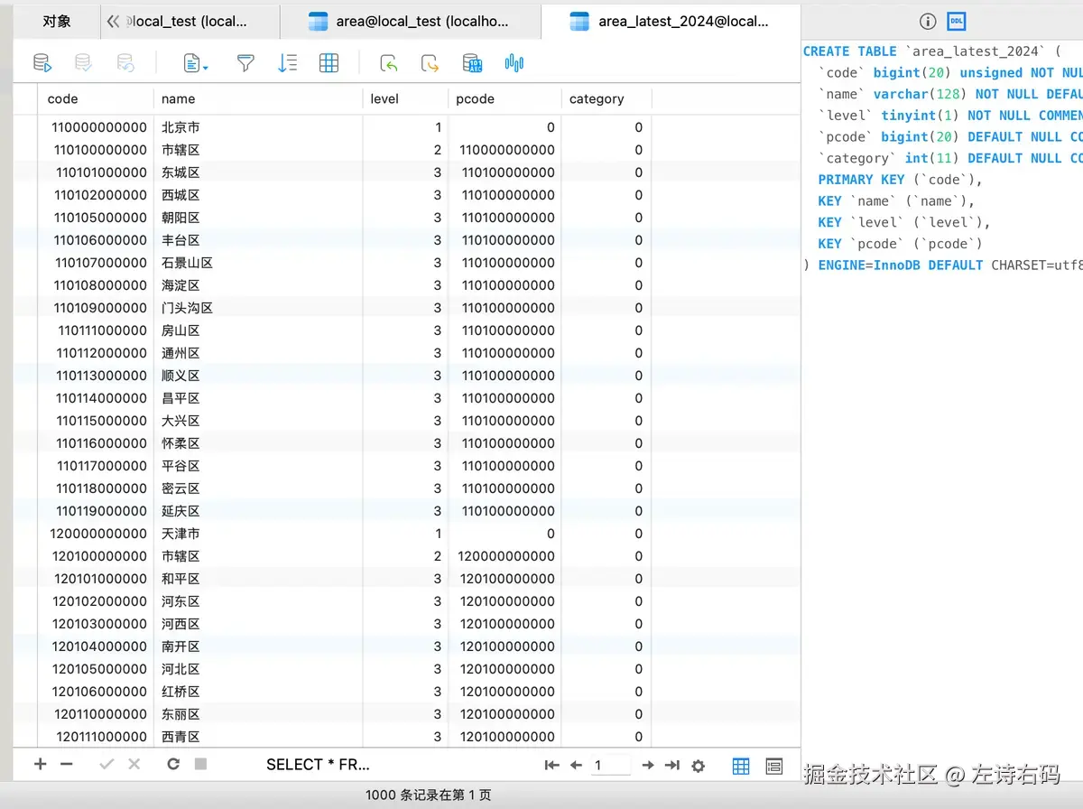 于是,我就直接下载了 area_code_2024.sql.gz 文件,然后在我本地数据库中导入了这份 SQL 。