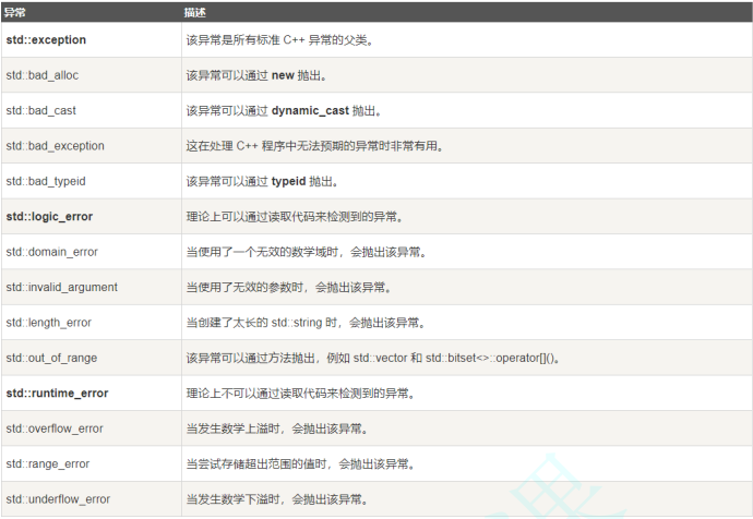 C++ 提供了一系列标准的异常,我们不用太关注。定义在 **<exception>**中,我们可以在程序中使用这些标准的异常。它们是以父子类层次结构组织起来的,如下所示: