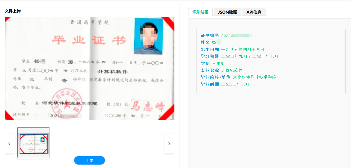 毕业证书识别系统的核心优势,在于技术的专业性与场景的适配性:作为学历类证件专用 OCR 产品,其模型基于海量真实毕业证书数据训练,适配不同院校、不同版本的毕业证书版式,识别准确率可达 98% 以上;同时,系统支持 API 接口、SDK 等多种集成方式,可快速对接各类业务系统,无需复杂改造。