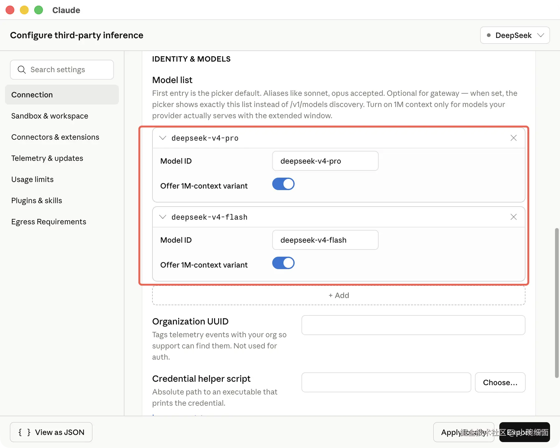 这里会打开第三方推理配置界面。官方推荐用这个 UI 来配置,因为它会校验字段,并能导出 macOS 的 .mobileconfig 或 Windows 的 .reg 配置。