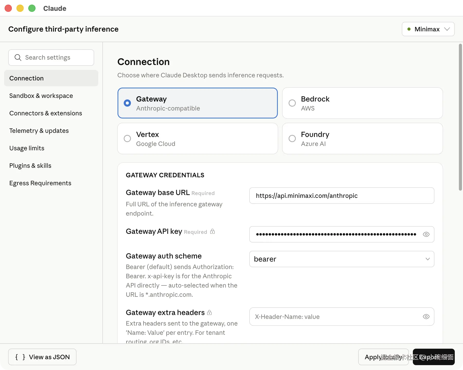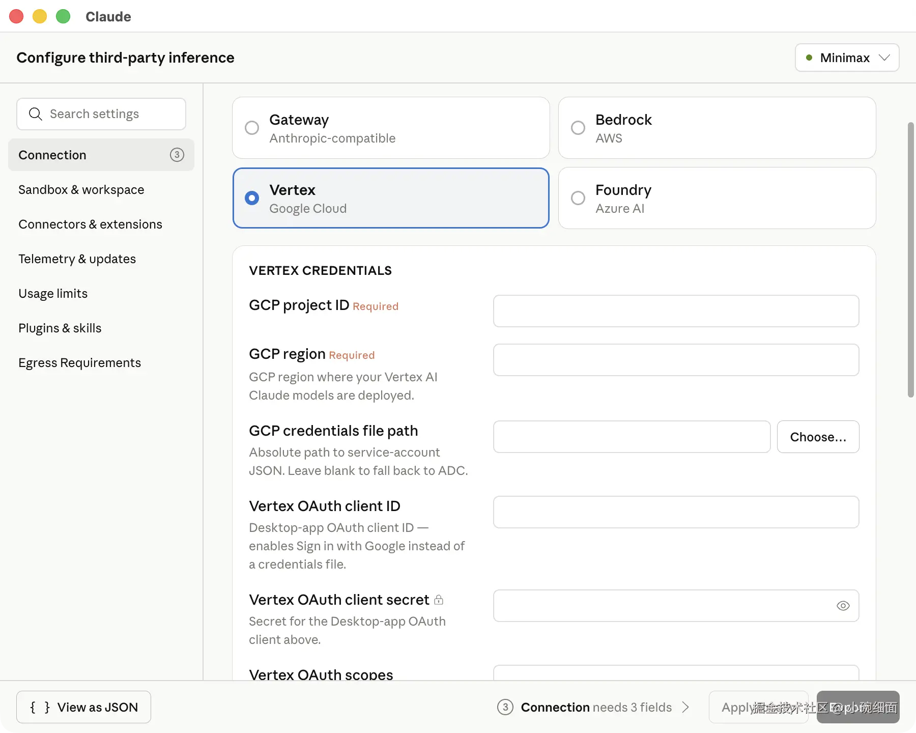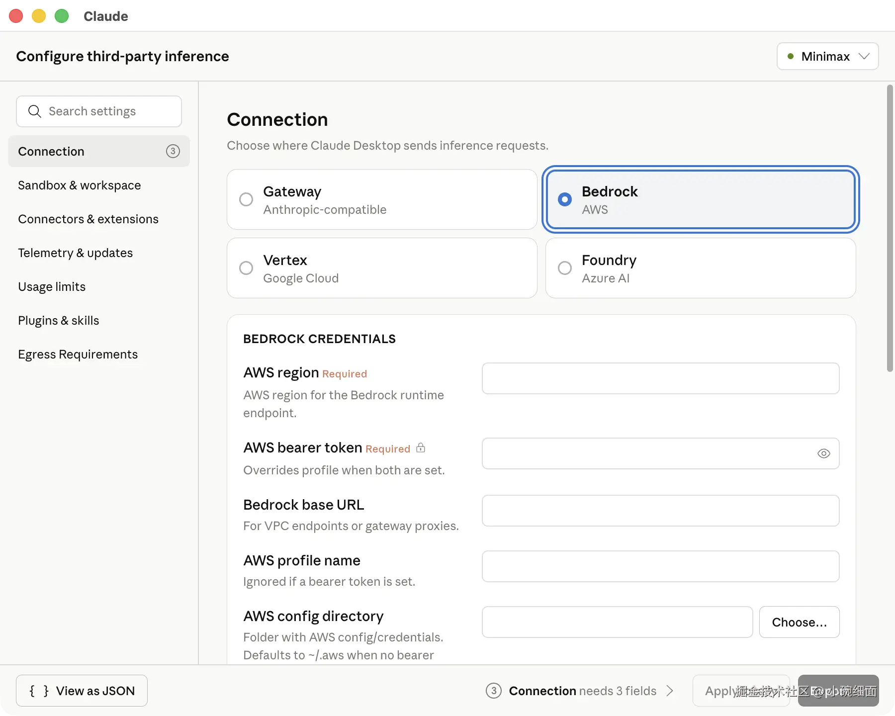 gateway、bedrock、vertex或foundry。 - 填写 provider 必填字段。