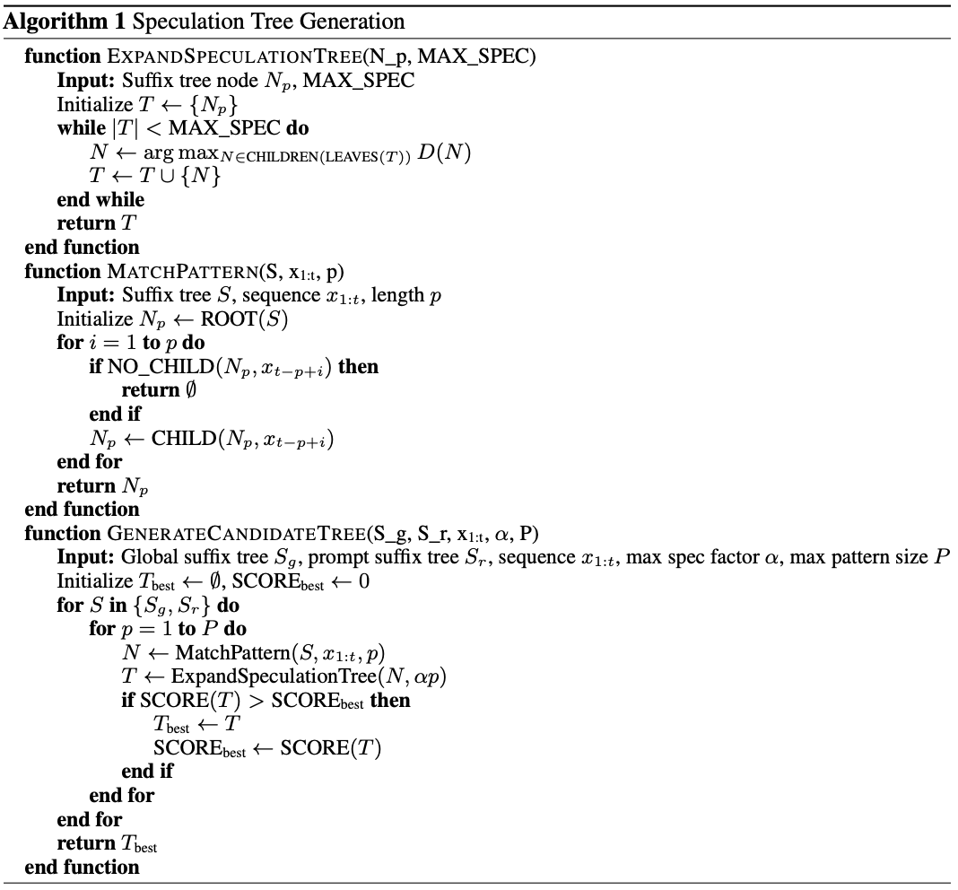 直觉上,若 D(N) 估计的是推测树 Tspec 中节点 N 被接受的概率,则 SCORE(Tspec) 估计的便是期望被接受的 token 总数。SuffixDecoding 随后选取 SCORE 最高的 Tspec 作为最终待验证的推测树。从推测树扩展到评分的端到端候选生成流程详见算法 1。