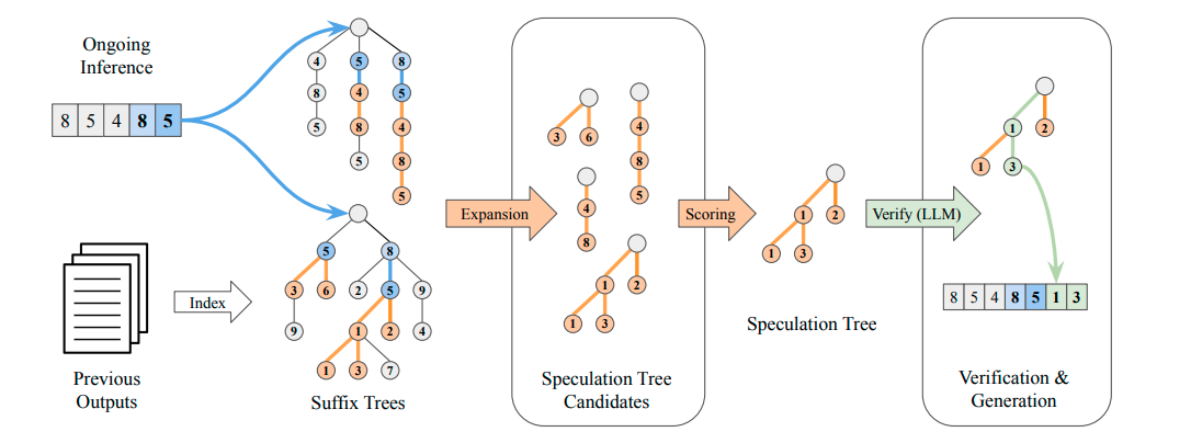 为此,SuffixDecoding 通过贪心扩展和评分流程构建一棵规模更小、可信度更高的推测树,并将这棵精简的推测树用于基于树的推测验证。SuffixDecoding 的整体流程如图 1 所示,本节后续部分将对其进行详细阐述。