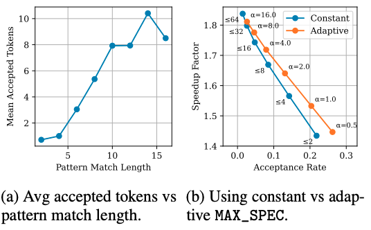 Figure 2: (a) the mean number of accepted tokens increases with the length of the pattern match, which motivates MAX_SPEC = αp. (b) shows that this choice achieves a better trade-off between acceptance rate and speculative speedup.
