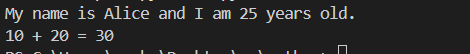 print(f"10 + 20 = {10 + 20}") # 甚至可以写表达式