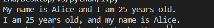 在字符串前加 f,用大括号 {} 直接写入变量或表达式。