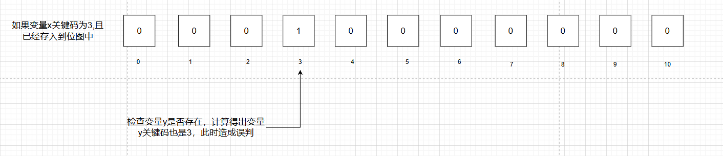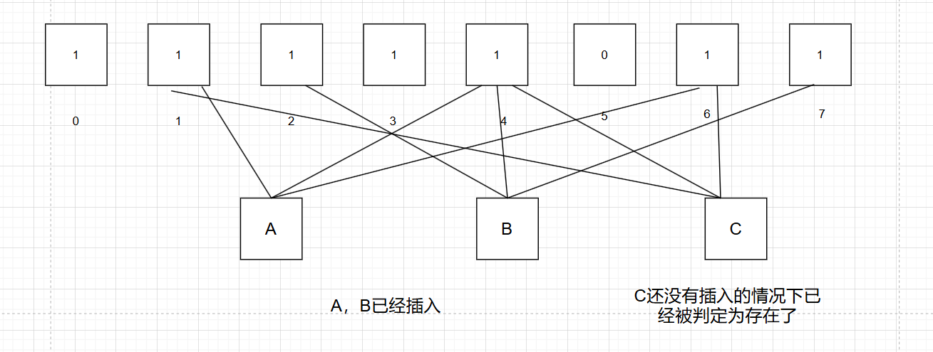 已知布隆过滤器一个数据要在位图上标注三个位置,容量不大的情况下,误判概率高,如下图所示