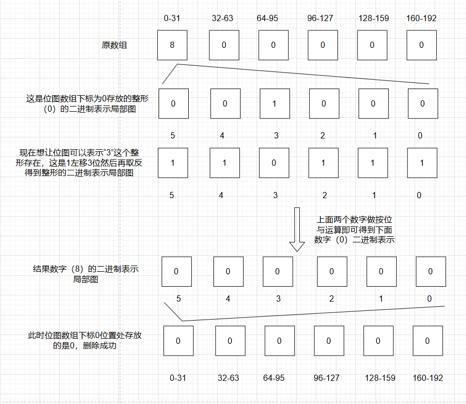 如果要在位图中删除某数字 ,定位方法和插入一致,但1左移后要取反 ,再用取反的结果和原数据做按位与运算,从而保证其它数字的状态不被改变
