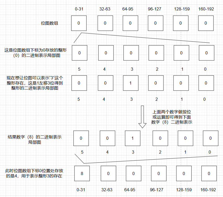 - **结果:**位图数组下标0位置处变成了8,用于表示0-31中只有3存在。