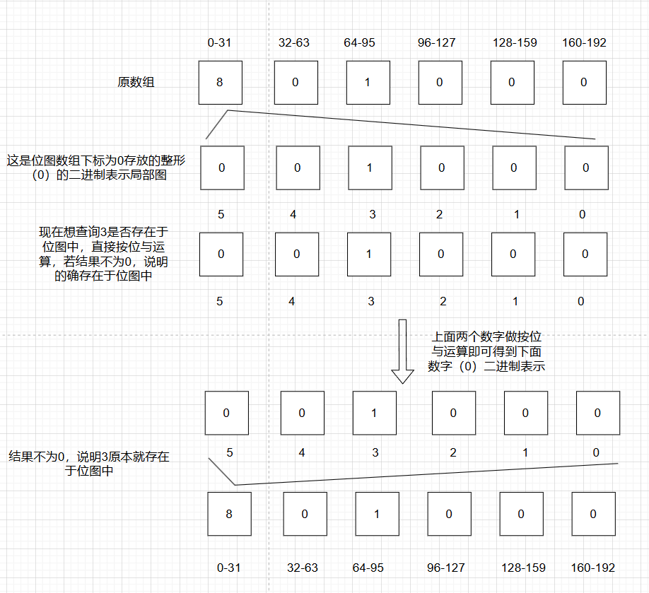 如果要查询位图中某个数字是否存在,定位方法不变,根据按位与运算得到的结果是否为0判断
