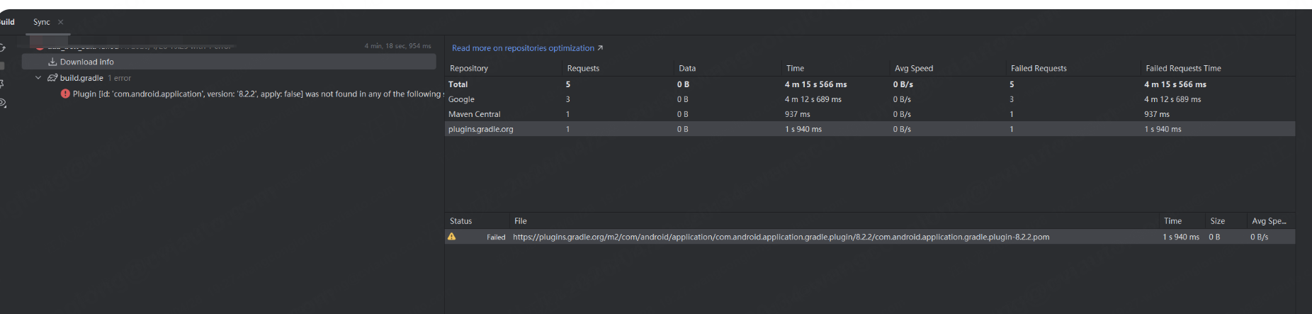 Plugin [id: 'com.android.application', version: '8.2.2', apply: false] was not found加上右边 5 个请求全失败、0 速度,说明:你的 Gradle 根本连不上任何仓库,下载不到 Android 插件!