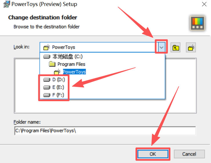8)点击向下展开按钮,选择除了 C 盘的任意一非系统盘,选择好安装路径后点击"OK":