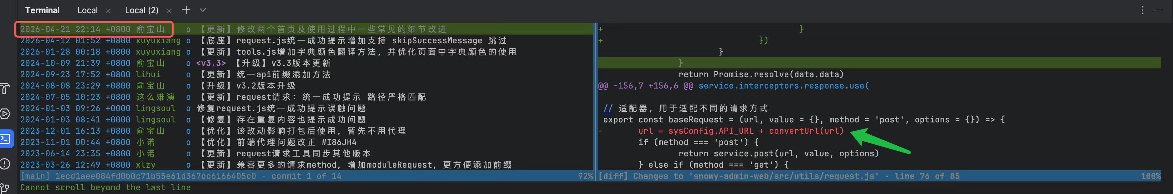 2026年04月23日,在研究snowy代码自动生成和撰写本文的过程中,领导说希望能把今天官方发布的最新的 v3.6.4 版本分支合并到项目中,然后我就拉取了官方的最新的代码,合并到了我们自己的代码仓库,解决了冲突,然后运行后发现了请求后端的接口莫名其妙的变了。从 v3.6.3 升级到 v3.6.4 之后,前端启动后会从调用
