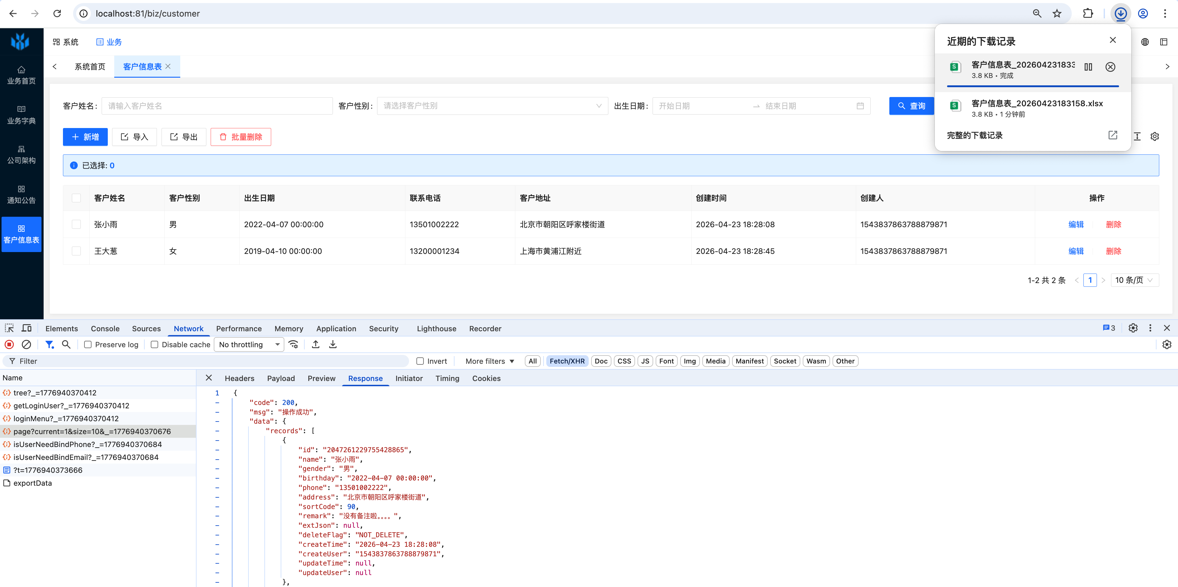 | Excel 导出 | 将当前查询条件下的客户列表导出为 Excel 文件(支持分页全部导出,非仅当前页) |