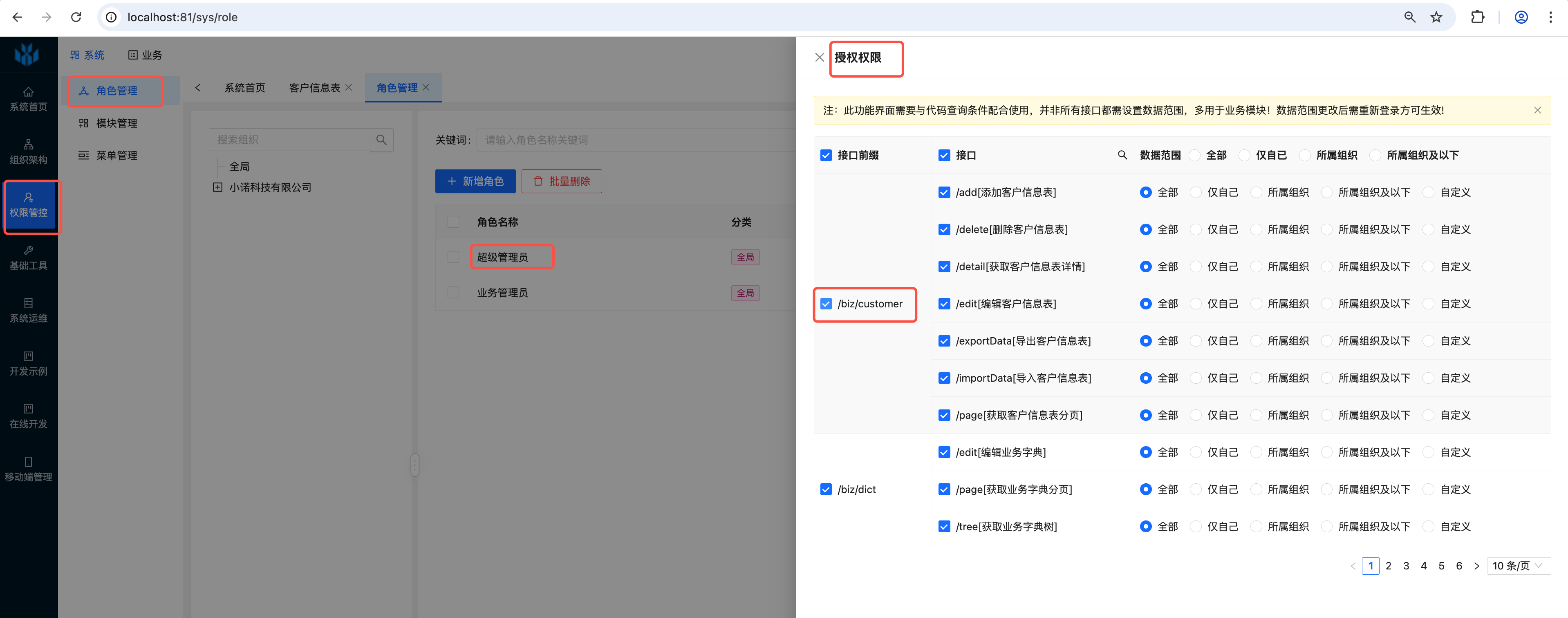 - 自动创建菜单和按钮权限,接下来只需要手动给指定角色授权即可;