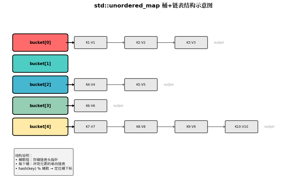 每个桶对应一个单向链表,当不同元素的哈希值映射到同一个桶时,所有冲突元素会挂载到该链表中。