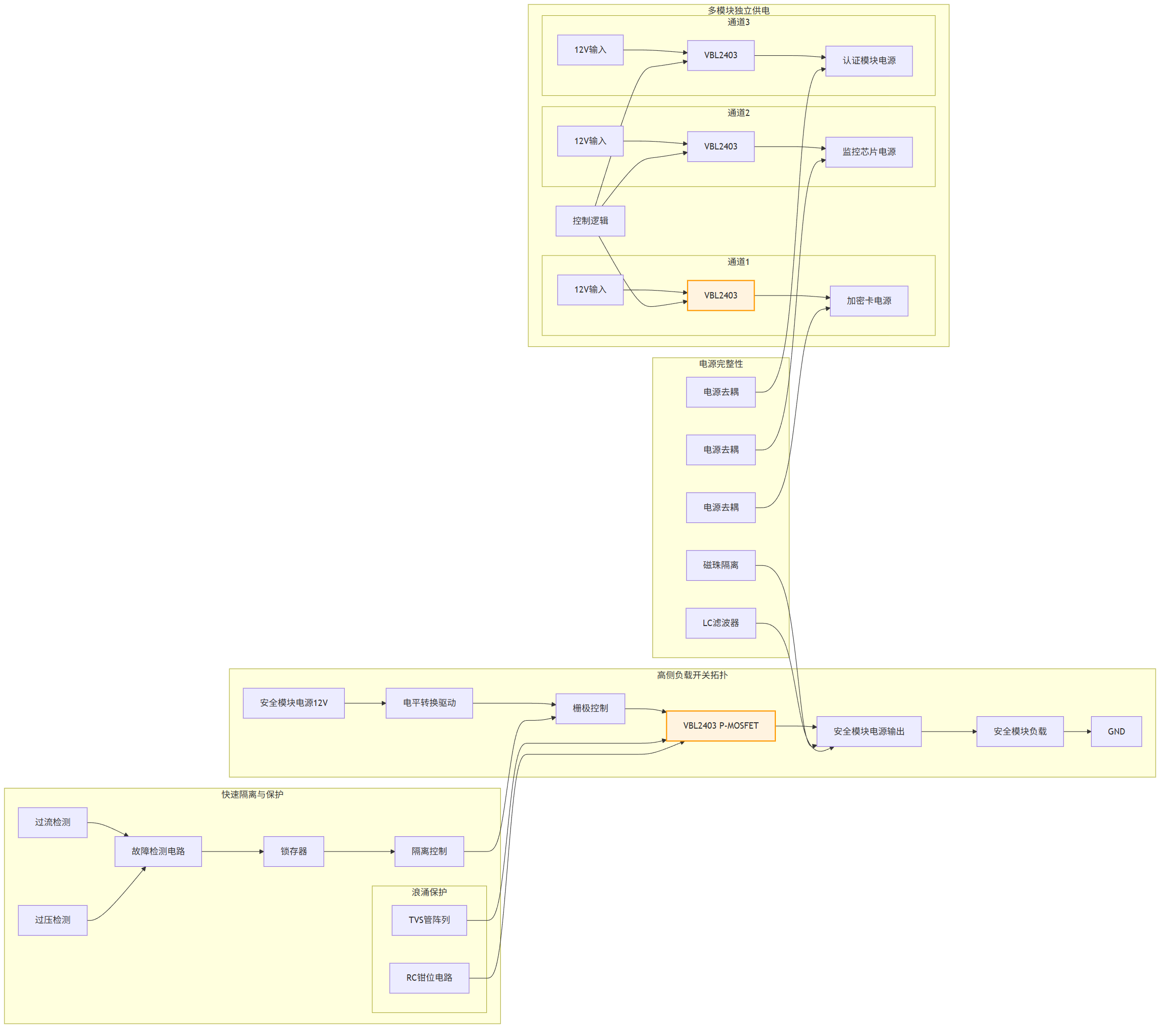 安全存储模块(如加密卡、安全监控芯片)需独立、可靠的电源路径管理,支持快速上下电与故障隔离,确保在异常情况下核心数据模块的安全。