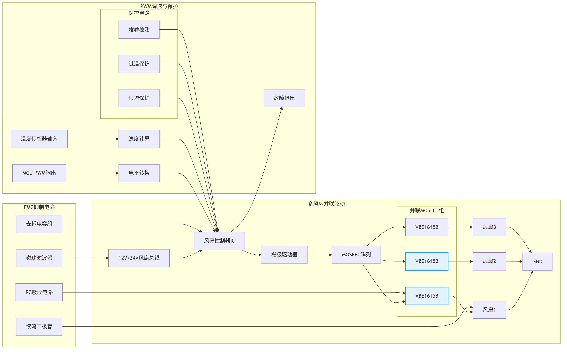 VBE1615B:可由专用风扇驱动IC或MCU的预驱输出直接驱动,栅极串联小电阻抑制振铃。