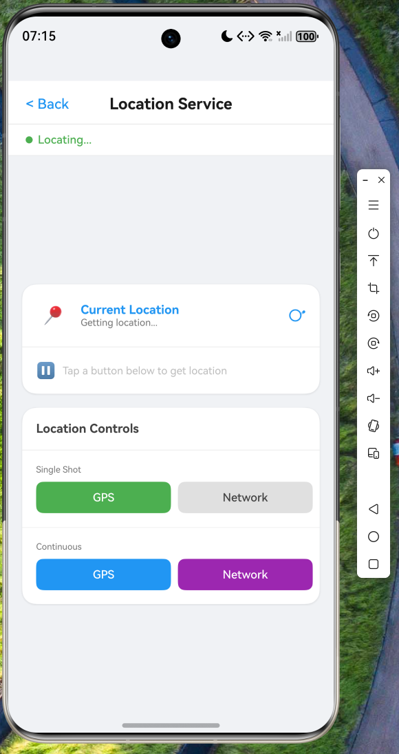 模拟器环境中,定位服务提供虚拟位置数据。应用启动后,点击首页 "Location" 进入定位服务页面,页面加载时播放淡入动画。点击 "GPS" 按钮触发单次定位,状态由 "Ready" 变为 "Locating...",成功后显示经纬度(31.976300, 118.792900)、海拔(23.0m)、精度(10.0m)、速度(0.0m/s),并自动展示逆地理编码后的地址信息。点击 "Network" 按钮触发网络定位模式。连续定位模式下,每次位置更新时计数器递增,再次点击同一按钮即可停止。
