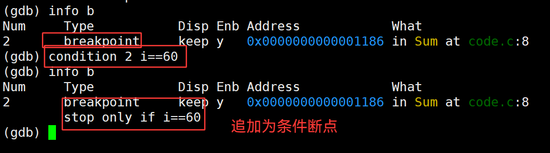 7.54 condition [断点编号] [变量名]==[内容] ------ 普通断点,追加为条件断点