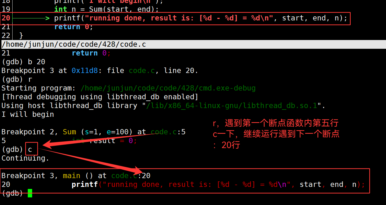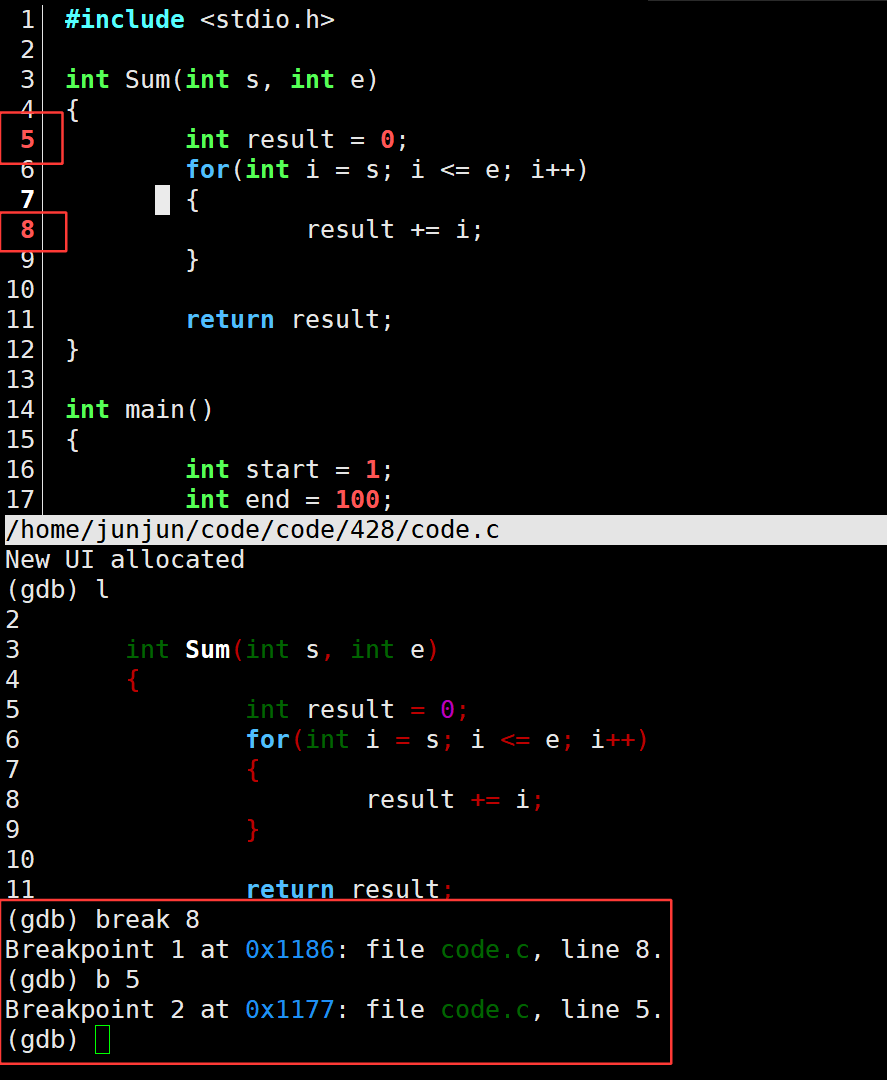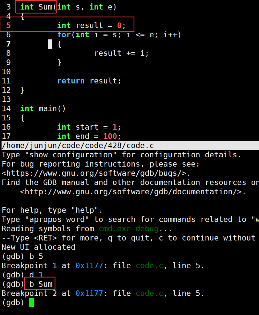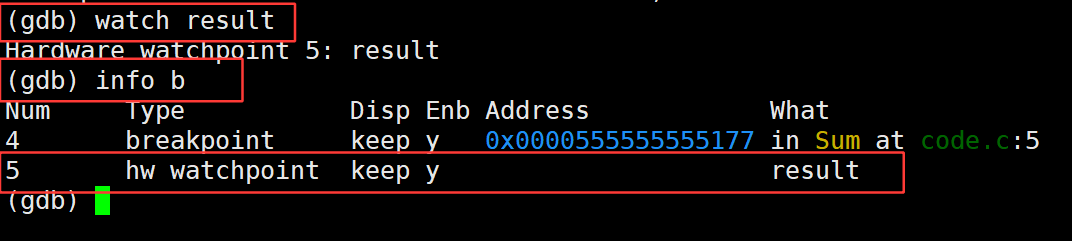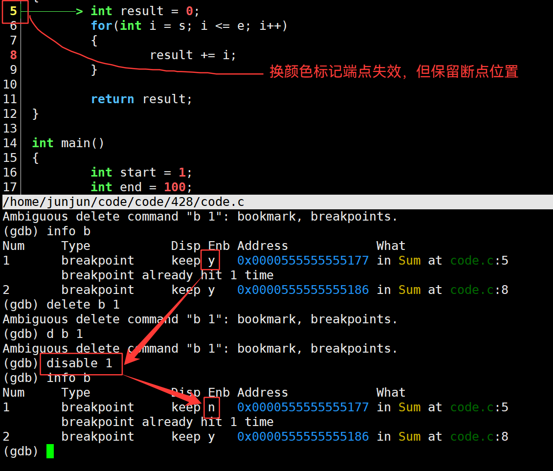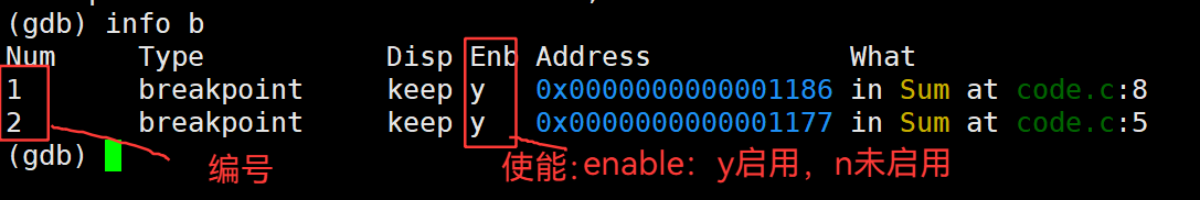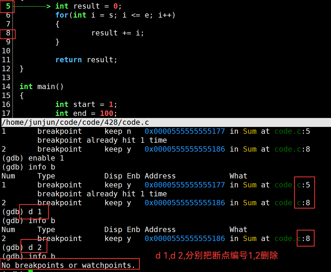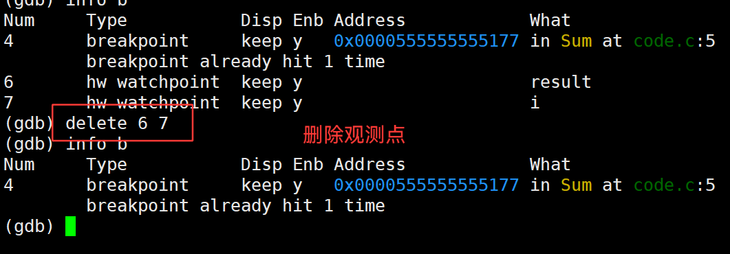 info b 可查看 监测点: delete [断点编号] 正常删除
