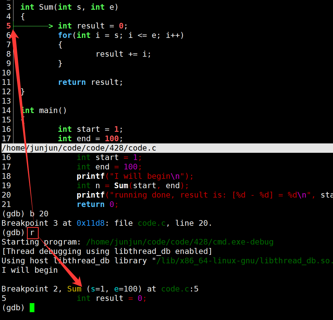 退出cgdb,vim打开源码,i插入模式,修改错误变量,退出vim,重新生成程序,运行...