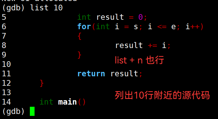 显示源代码,从上次位置开始,每次列出 10 行 | list / l 10 |