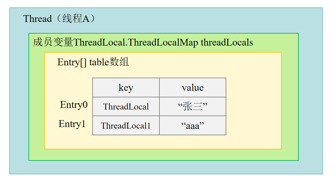 输出结果:线程1打印"张三",线程1的threadLocal1打印"aaa",线程2打印"李四",主线程打印"null"------三个线程互不影响。