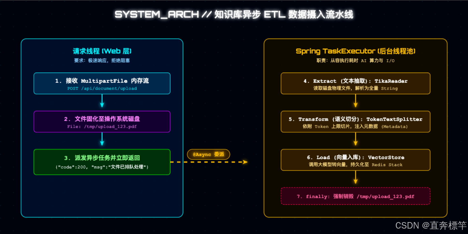 我们通过@Async注解实现了HTTP网络协议与AI算力的隔离,用物理文件跨越了Tomcat的生命周期陷阱,从接收内存流、落盘固化,到Tika提取、语义Splitter切分,再到VectorStore加载、临时文件回收,完整搭建了一条高内聚、可复用的ETL数据摄入流水线,为后续RAG对话功能打下了坚实基础。