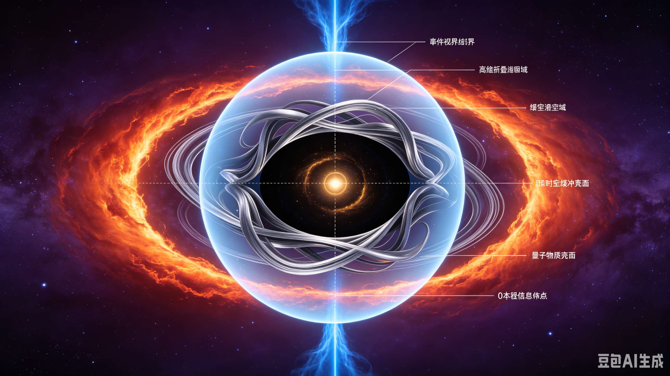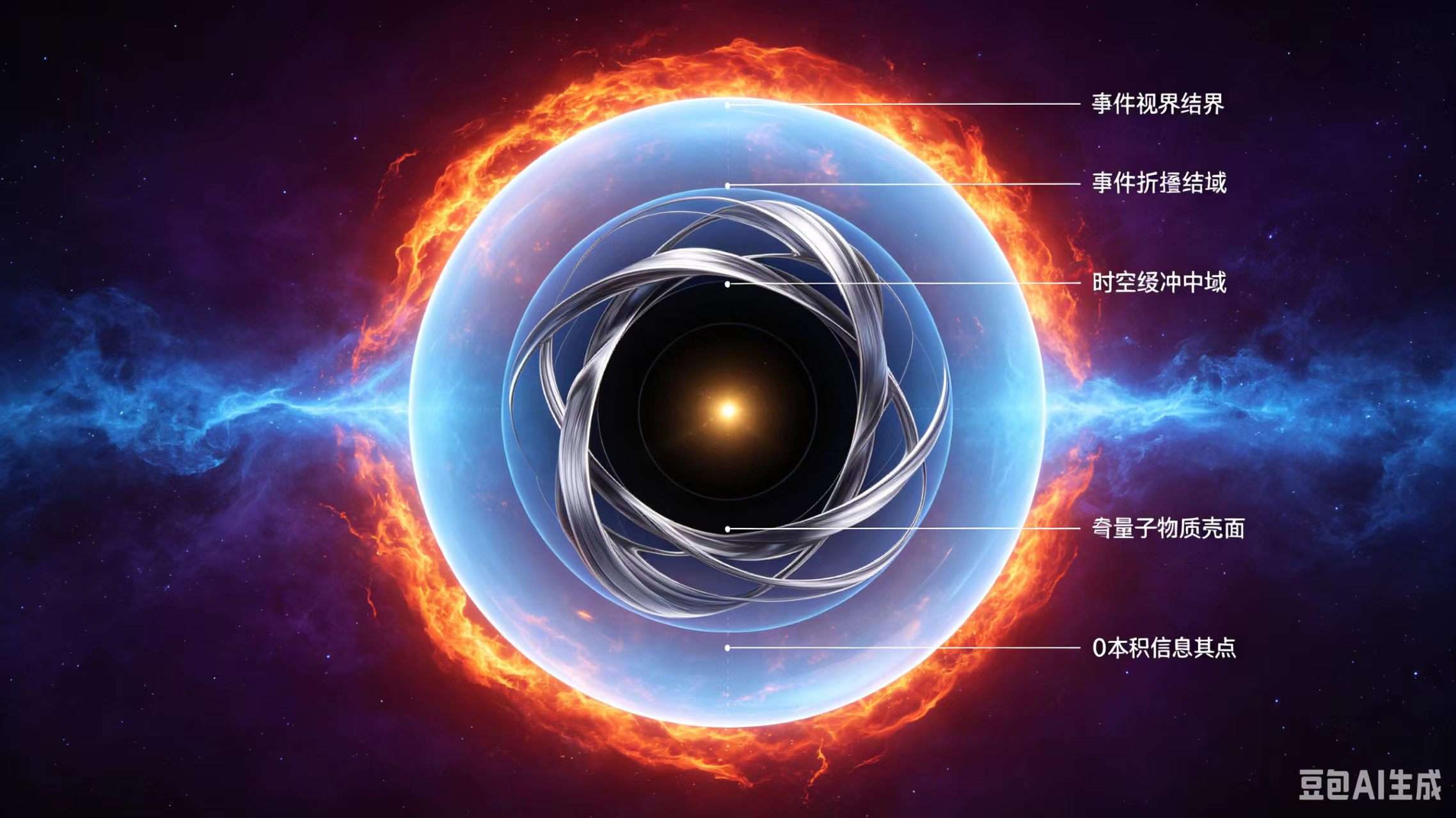 事件视界结界 → 高维折叠时空 → 致密坍缩物质壳 → 信息规则奇点 - 黑洞本质: