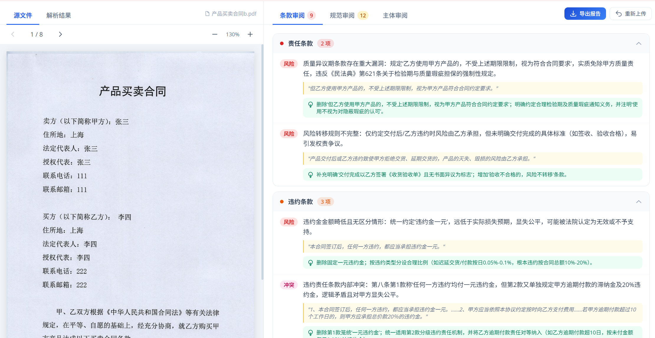 clause_review适合按风险类别分组展示norm_review适合按严重程度和问题类型展示parties则可以直接进入报告首页或摘要部分