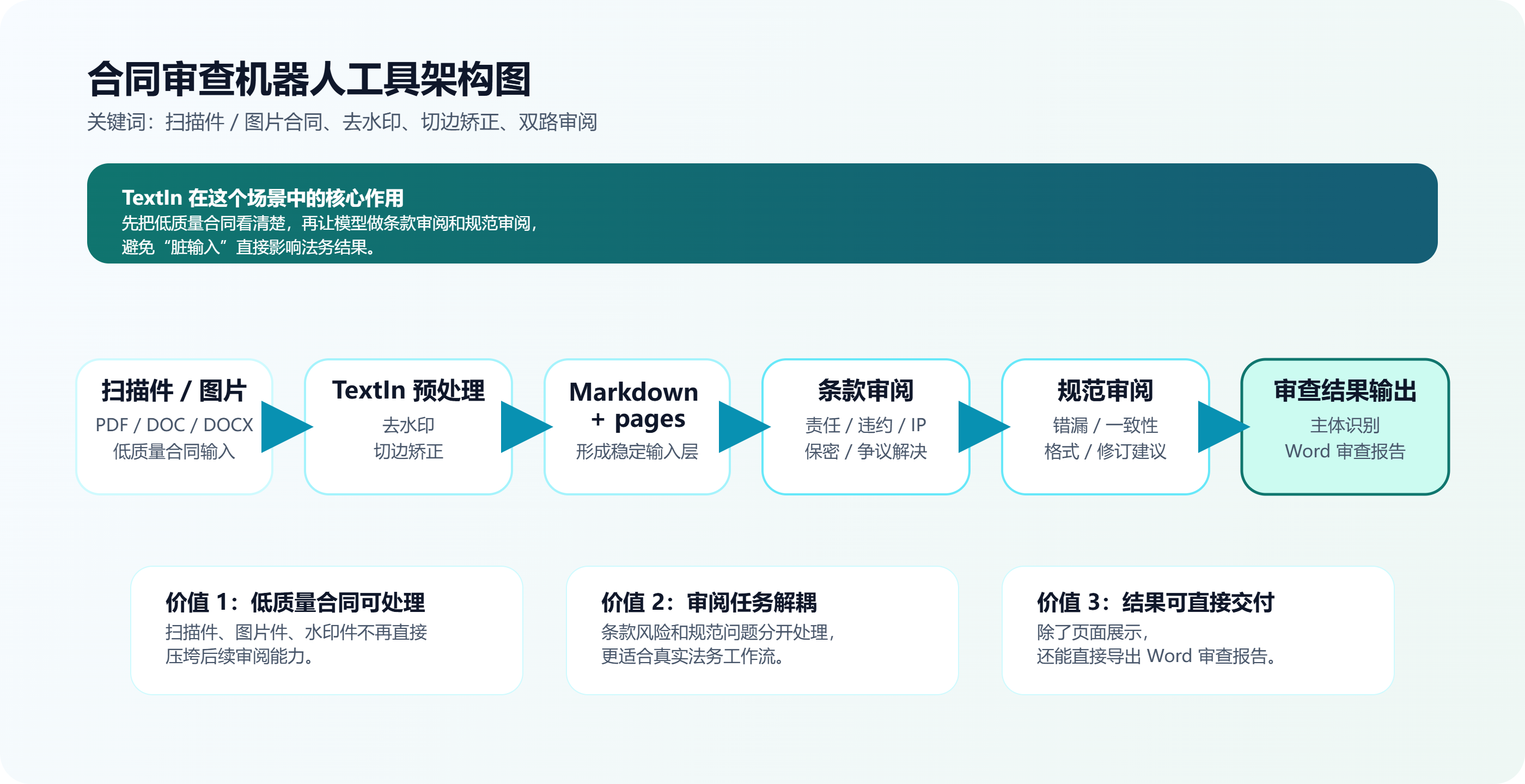 以上是一种"先解析清洗、再双链路审阅"的合同审查实践方案。核心思路是把低质量合同(扫描件、拍照件、水印 PDF)先通过 TextIn 统一成干净的 markdown + pages 中间层,再将法律语义风险与文本规范问题拆成两条独立的审阅链路,分别输出固定 JSON,最终合并生成结构化审查报告。方案已发布在 GitHub,欢迎大家在项目中与我们交流。如果你在实际处理合同时遇到更复杂的场景(如手写体干扰、印章遮挡、多版本修订痕迹等),或者有不同的架构思路,欢迎留言或私信探讨。