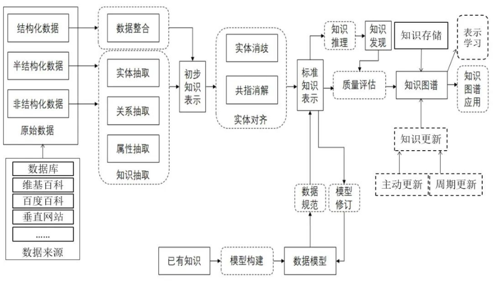 实体对齐:跨数据源匹配相同实体。 这些操作最终形成统一的标准知识表示。 - 知识本体建模与规范:基于已有知识和领域经验,进行模型构建,定义知识图谱的数据模型(如本体或schema)。同时通过数据规范和模型修订来优化知识表示的一致性和可扩展性。