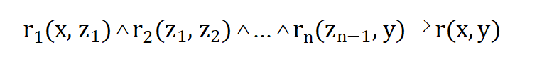 这种规则也称为路径规则或称为封闭式规则。这种规则的体部原子中的变量从头节点x开始,如r1(x, z1)沿着图谱中的路径r2(z1, z2),一直到rn(zn−1, y)其中y对应尾节点。