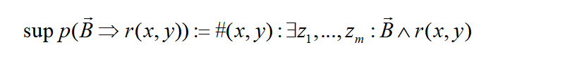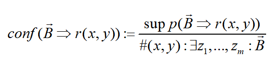 置信度(confidence)是用规则的Grounding数除以满足体部定义的实例数。满足体部定义的实例未必都会推导得出头部原子,因此,这个指标衡量了某个规则的可信程度。支持度除以仅符合规则体的实例数目。