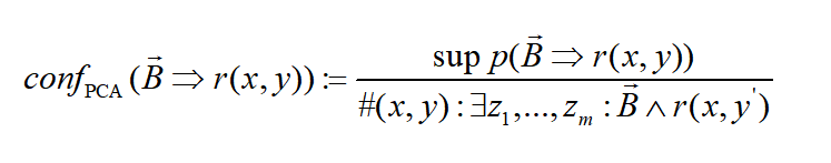 PCA置信度:传统的置信度定义基于封闭世界假设,即图谱中不存在的三元组都被视为错误的。知识图谱通常要求采用开放世界假设,即知识图谱中不存在的事实不一定是错误的。PCA置信度只将满足规则体部并且存在三元组的激励才计入分母,在一定程度上考虑了知识图谱本身的不完备性。
