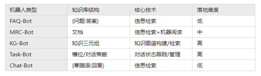 (5)Chat-Bot: 闲聊对话,一般用于提高机器人的趣味性,比如"你是谁?","你是机器人吗?"等。在学术上一般基于end-to-end的方案,可以支持多轮,但是回复结果不可控。所以在实际落地中还是会转换成FAQ-Bot,预先构建一个寒暄库,转换成检索的任务。