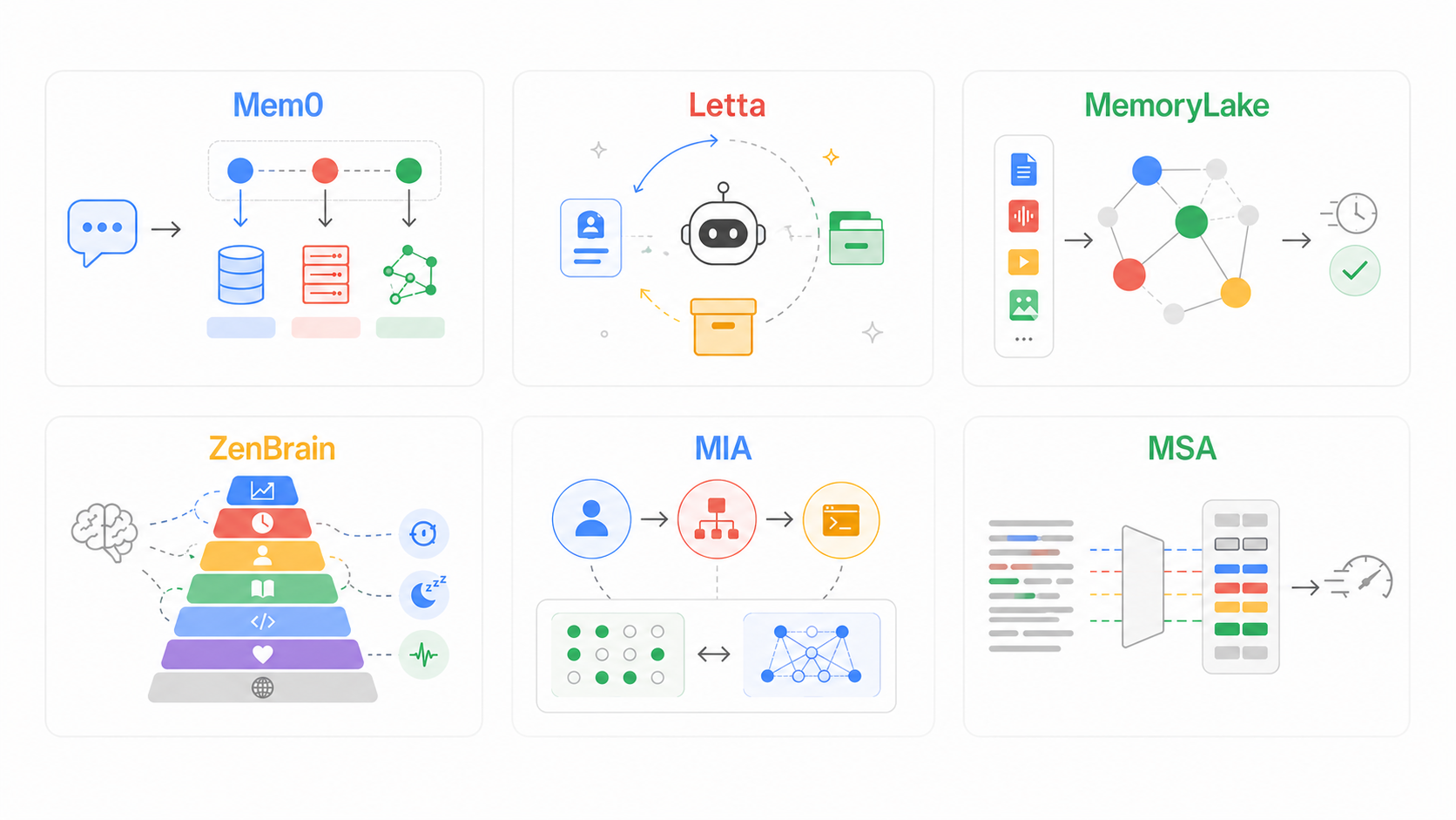 2026年,AI Agent赛道的竞争焦点已从基础模型性能转向记忆能力------当通用大模型的智能水平差距越来越小,能否像人类一样主动存储、筛选、巩固记忆,甚至形成用户个性化的用户记忆进而形成人格,成为AI能否从"一次性工具"升级为"长期伙伴"的核心门槛。在当前市场中,Mem0,Letta,MemoryLake,ZenBrain,MIA,MSA六个典型热门记忆架构有相似又有不同,开发者经常混淆它们的技术路径与适用场景,甚至将"外部记忆库"与"神经科学模拟记忆"等概念混淆,导致选型偏差。本文将通过梳理定义、多维对比与深度分析,帮你快速掌握六大架构。