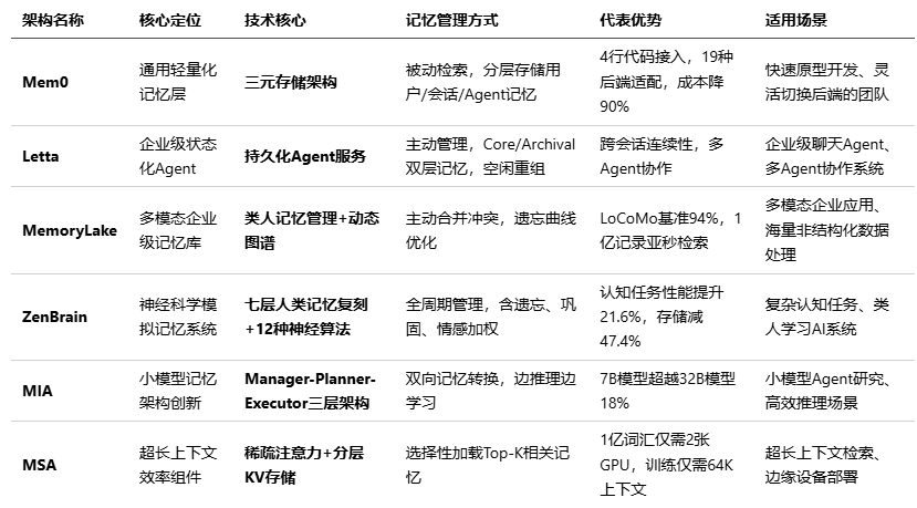 为进一步让大家快速理解和区分六大架构的技术路径与特征,以下从核心定位、技术核心、记忆管理方式、代表优势、适用场景五个维度展开对比: