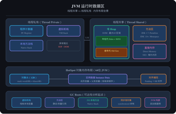 JVM 是 Java 程序员绕不开的核心知识,也是面试中的高频考点。中高级岗位通常会从以下几个维度考察: