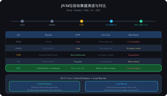 - 收集器:CMS(标记-清除,有碎片)vs G1(分区,停顿可控)vs ZGC(着色指针,亚毫秒)