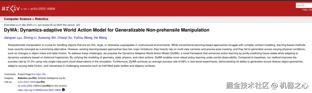 它引入了将 World Model 与 Action Model 统一的 WAM 框架。虽然这一方向如今已是大热点,但早在 2025 年 3 月,银河通用就发表了论文,在全球范围内首次对 WAM 的概念进行了结构化定义,详见机器之心往期报道《机器人不只会抓和放!北京大学X银河通用「世界-动作模型」赋能全面泛化的非抓握技能》。
